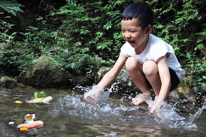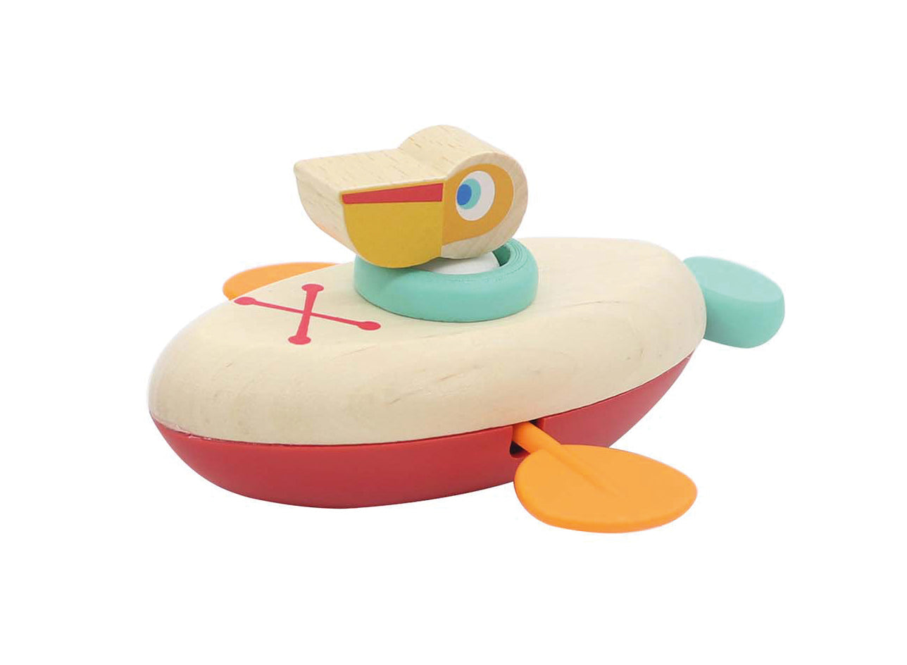 A canoe that is wound with a string at the back to move the oars. Put it in the water and follow it!