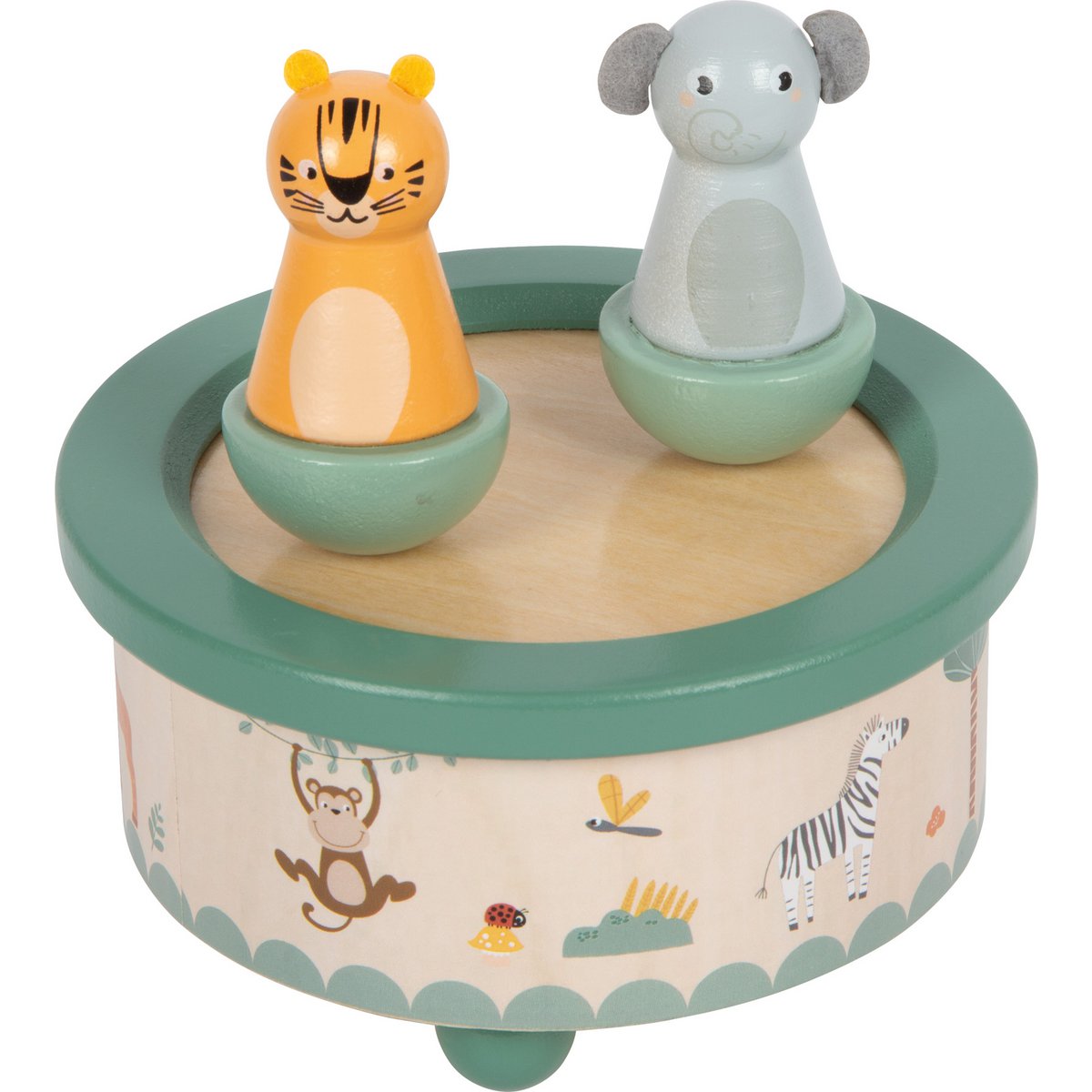 Κούρδισε το κουτί από το κουρδιστήρι στο κάτω μέρος του, τοποθέτησε τις μαγνητικές φιγούρες της τίγρης και του ελέφαντα στο πάνω μέρος και δες τες να στροβιλίζονται, καθώς η μελωδία "Twinkle Twinkle Twinkle Little Star" παίζει.