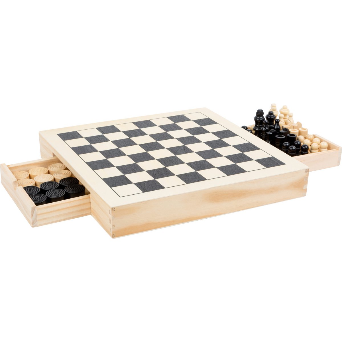 Ξύλινο ταμπλό με τρεις πλάκες για καθένα από τα 3 παιχνίδια: σκάκι, ντάμα και nine men's morris. Θήκες στις δύο πλευρές του ταμπλό για τα πούλια, πιόνια που θέλεις να αποθηκεύσεις.