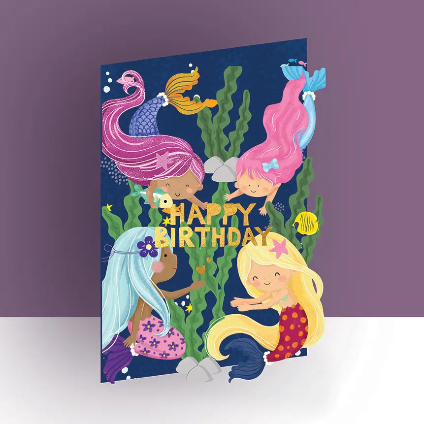 Ευχετήρια κάρτα για νγενέθλια που παριστάνει μικρές γοργόνες να κολυμπούν στον βυθό, ενώ το μήνυμα "Happy Birthday" προβάλλει με χρυσά γράμματα από μπροστά.