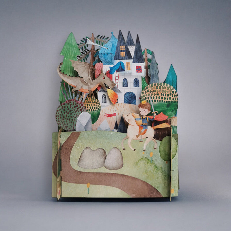 Μια ολόκληρη ιστορία με κάστρο, ιππότη και δράκο ξετυλίγεται καθώς ανοίγεις αυτή την κάρτα.  Κάτι περισσότερο από μια κάρτα ευχών, ένα δώρο που μπορείς να στολίσεις και να θυμάσαι τους αγαπημένους σου που σου την χάρισαν.