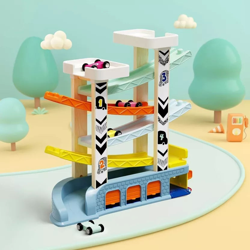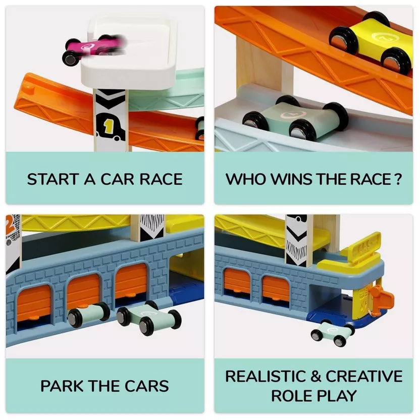 Παιχνίδι με αυτοκινητάκια και ξύλινη πίστα-ράμπα 4 επιπέδων, με χρώματα που ταιριάζουν και σε αγόρια και σε κορίτσια. Σταθμός ανεφοδιασμού στο ισόγειο επίπεδο και 3 θέσεις στάθμευσης με πόρτα δίπλα του.