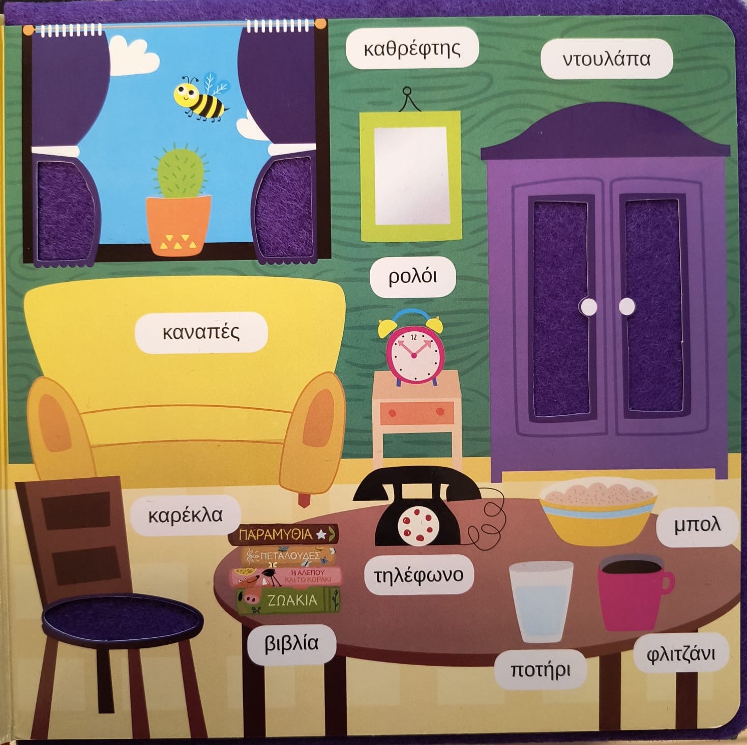 Διαδραστικό βιβλίο από τσόχα με χαρτονένιες σελίδες. Με θέματα από την φύση, το σπίτι, την οικογένεια, το δρόμο, περιέχονται εικόνες από λέξεις που συναντάμε συχνά στην καθημερινότητά μας.