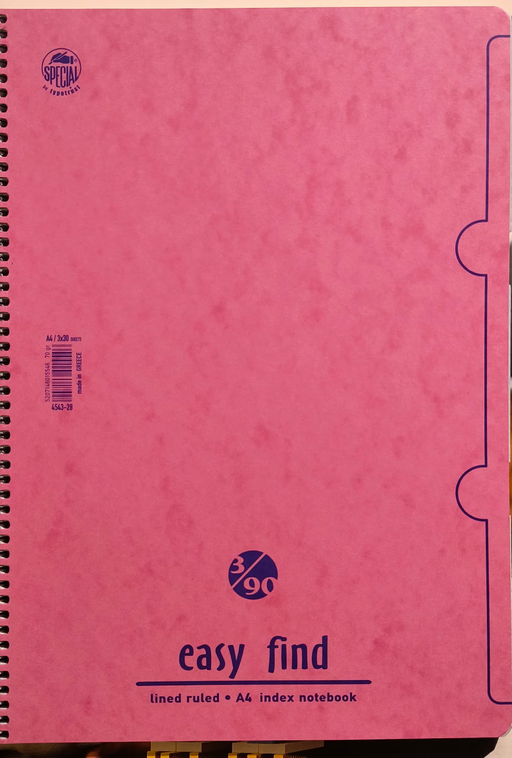 Τετράδιο σπιράλ Α4 ριγέ με μικρό περιθώριο, τριών θεμάτων, με χάρτινο εξώφυλλο 335 gsm, δεμένο με σπιράλ. Με στρογγυλεμένες γωνίες, μικρό περιθώριο στο πλάι. Με ευρετηρίαση και διαχωριστικό ανάμεσα σε κάθε θέμα.