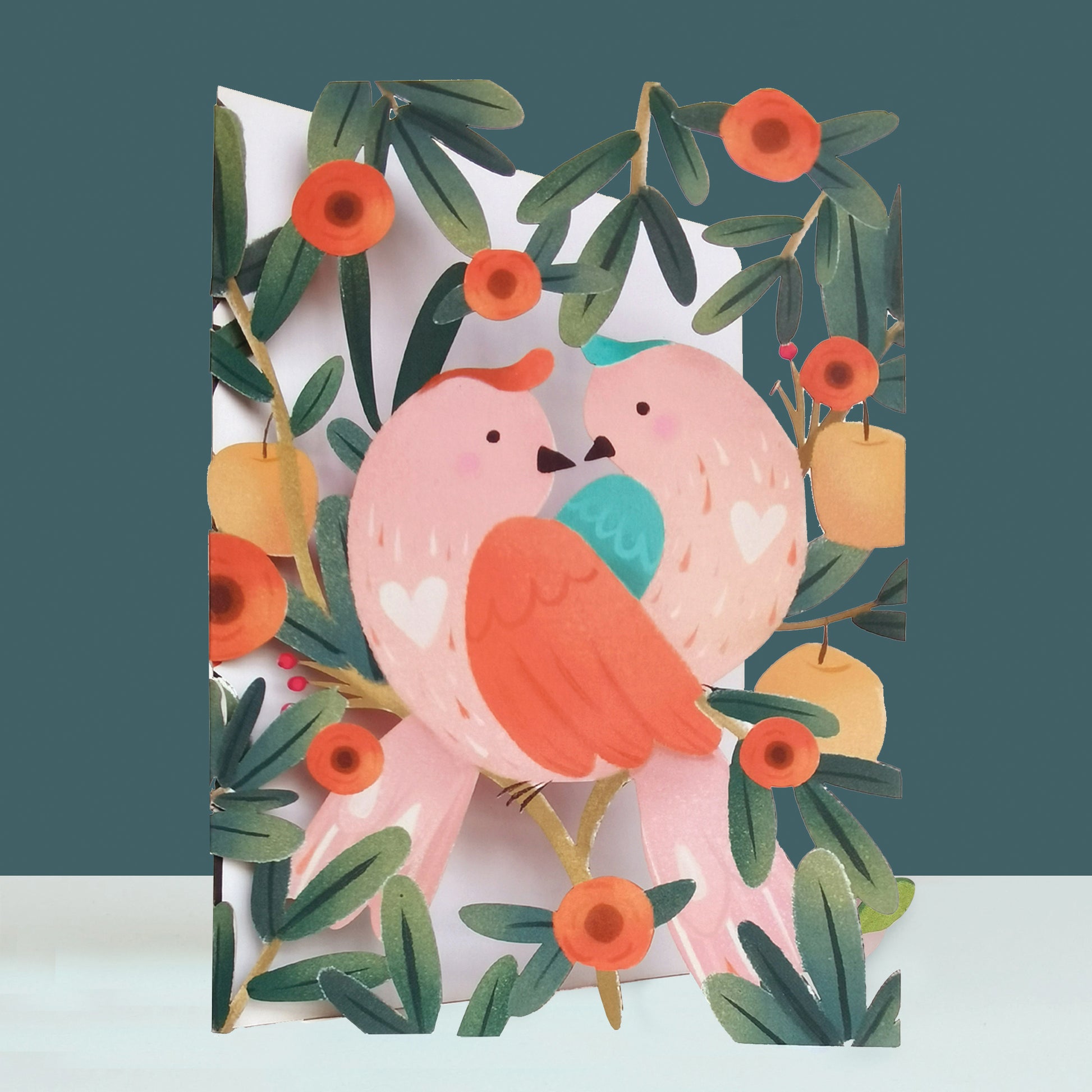 Ευχετήρια κάρτα για ερωτευμένους, κατάλληλη για την ημέρα του Αγίου Βαλεντίνου ή για επέτειο γάμου ή για νεόνυμφους, αλλά και για οποιαδήποτε μέρα που θέλουμε να εκφράσουμε την αγάπη μας στο ταίρι μας. Παρριστάνει δύο πουλάκια σε κλαδιά, περιτρυγυρισμένα από φύλλα, λουλούδια και καρπούς.