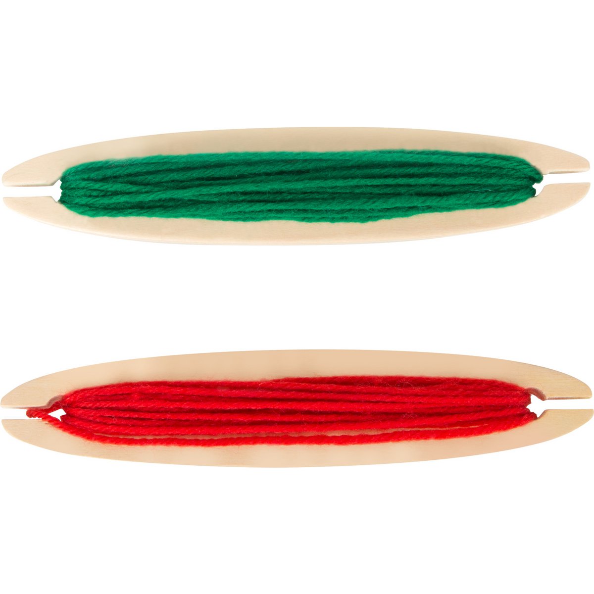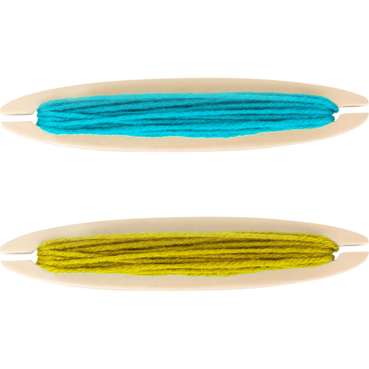 Ξύλινος αργαλειός με 4 διαφορετικά χρώματα νημάτων, κίτρινο, πράσινο, κόκκινο και θαλασσί.