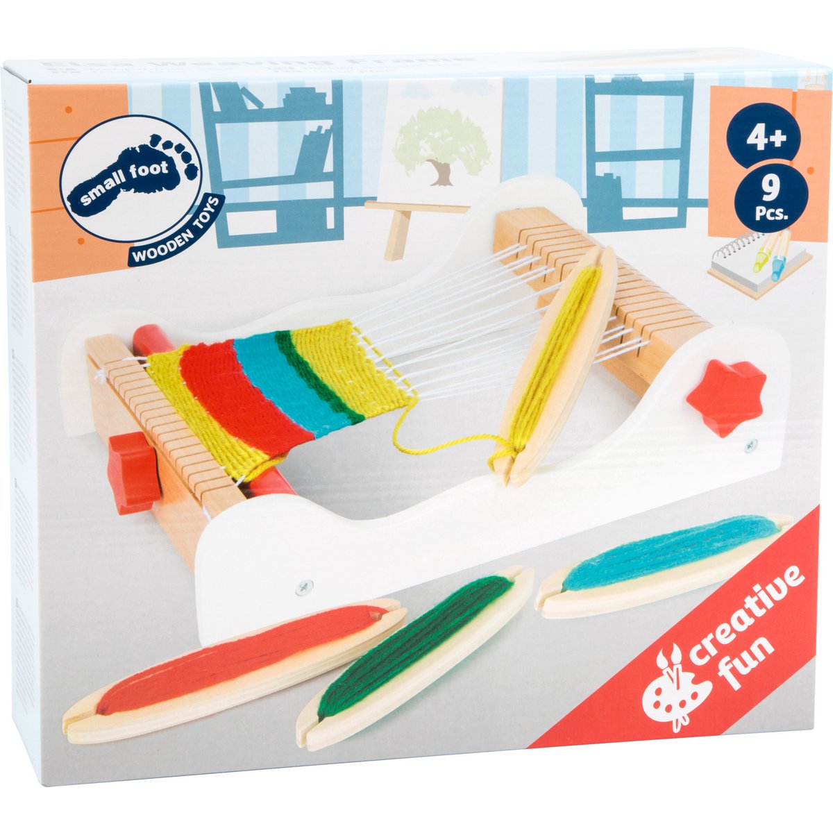 Με περασμένο το στημόνι και τέσσερις σαΐτες με τα νήματα ήδη περασμένα για να μπορείς να ξεκινήσεις κατευθείαν το υφαντό σου.
