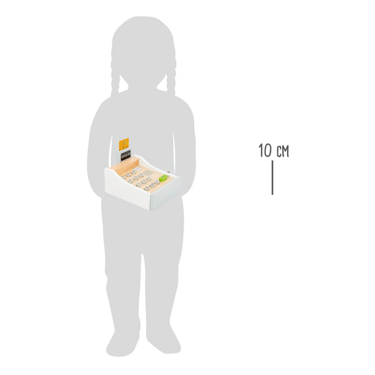 Ξύλινη, με κουμπιά που πατιούνται, υποδοχή για την πιστωτική κάρτα, που περιέχεται, χρήματα, σκάνερ και συρτάρι από κάτω για τα χρήματα. Όλα όσα χρειάζονται για να στήσεις το ταμείο του μαγαζιού σου.